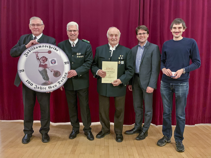 Wir haben uns zur diesjährigen Weichnachtsfeier im Adolf-Hölzl-Haus getroffen. Dabei gab es eine Rede von Oberbürgermeiser Florian Hartmann, Musik von der Bachener Stubenmusi und das Theaterstück "Wunschbüro Engel", vorgetragen von der Theaterjugend des ASV Dachau. Wichtiger Programmpunkt aber war die Ehrung langjähriger und verdienter Mitgleider. Schützenmeister Rober Schäffler überreichte zusammen mit Gau- und Bezirksschützenmeister Alfred Reiner dabei an Josef Ettenberger die Ehrennadel für 60 Jahre Mitgleidschaft bei Frohsinn Udlding udn dem Bayerischen Sportschützenbund. Die beiden Mitgleider Andreas Nostoll, ebenfalls seit 60 Jahren dabei, sowie Rainer von Hofmann, der 40 Vereinsjahre auf dem Buckel hat, waren bei der Feier leider nicht persönlich anwesend. Von Frohsinn Udlding erhilet Maximilian Rösch für besondere Verdienste den Taler des Schützengaus Dachau, der eigens zum 100. Gaujubiläum in diesem Jahr geprägt worden war. Bei der 100-Jahr Feier im November hatte Robert Schäffler den Bestschuss, einen 10,2 Teiler, erziehlt und damit die Ehrenscheibe des Jubiläums gewonnen. Dieses schöne Stück wurde ihm am Abend der Weihnachtsfeier durch Alfred Reiner überreicht.